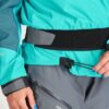 Vita regolabile con overskirt (gonna interna) che si aggancia al tubo della sprayskirt del kayak, polsi e collo regolabili in polyurethane “hook-and-loop” (velcro) per una perfetta tenuta, tasca sul braccio con zip splash-proof per piccoli oggetti.