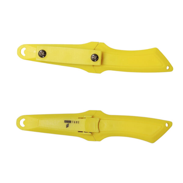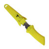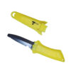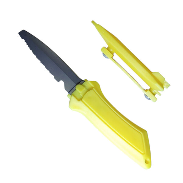Il fodero in plastica rigida di colore giallo brillante garantisce massima visibilità ed è facilmente fissabile al giubbotto salvagente o alle cime del kayak. Grazie al sistema di sgancio rapido, il coltello può essere estratto o riposto con una sola mano in pochi istanti.