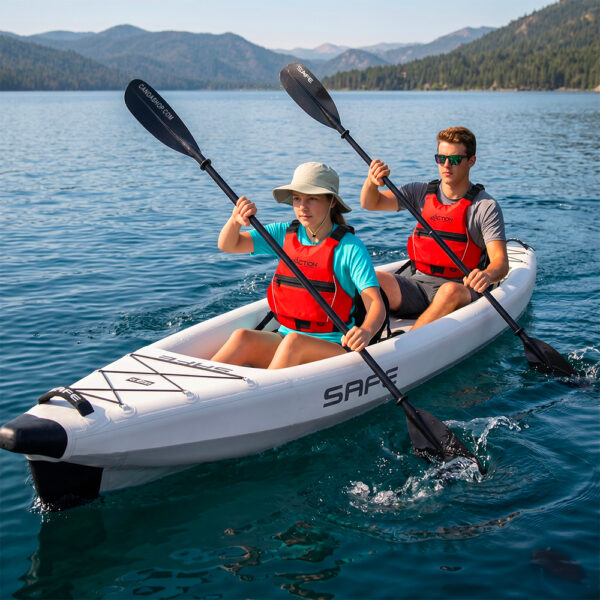 Safe Kayak HP 2 è un kayak ad alta pressione per due persone completamente in drop-stitch, veloce, rigido e facile da gonfiare. È il perfetto compromesso tra una gonfiabile e una barca rigida. Questo nuovo kayak 100% drop-stitch, dotato di prua e poppa sagomate, offre una planata incomparabile e un ampio spazio interno anche per diversi giorni di navigazione. Nella confezione del kayak troverai una pompa manuale ad alta pressione, 2 sedili imbottiti per kayak, una borsa per il trasporto, due pagaie e un kit di riparazione.