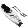 Nella confezione del kayak troverai una pompa manuale ad alta pressione, 2 sedili imbottiti per kayak, una borsa per il trasporto, due pagaie e un kit di riparazione.