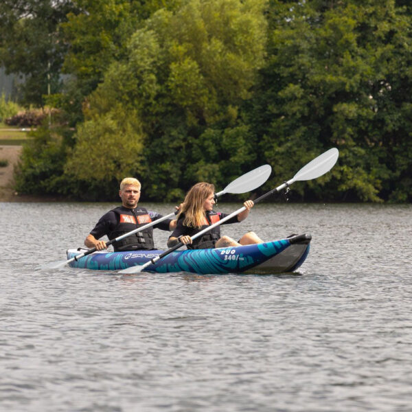 Il design attraente e funzionale del Duo 340 combina comfort e praticità e garantisce ogni volta un’esperienza di pagaiata sicura e piacevole. Viene fornito come un pacchetto completo con tutto il necessario in modo da poter iniziare subito, basta gonfiare e godersi il tempo in acqua!